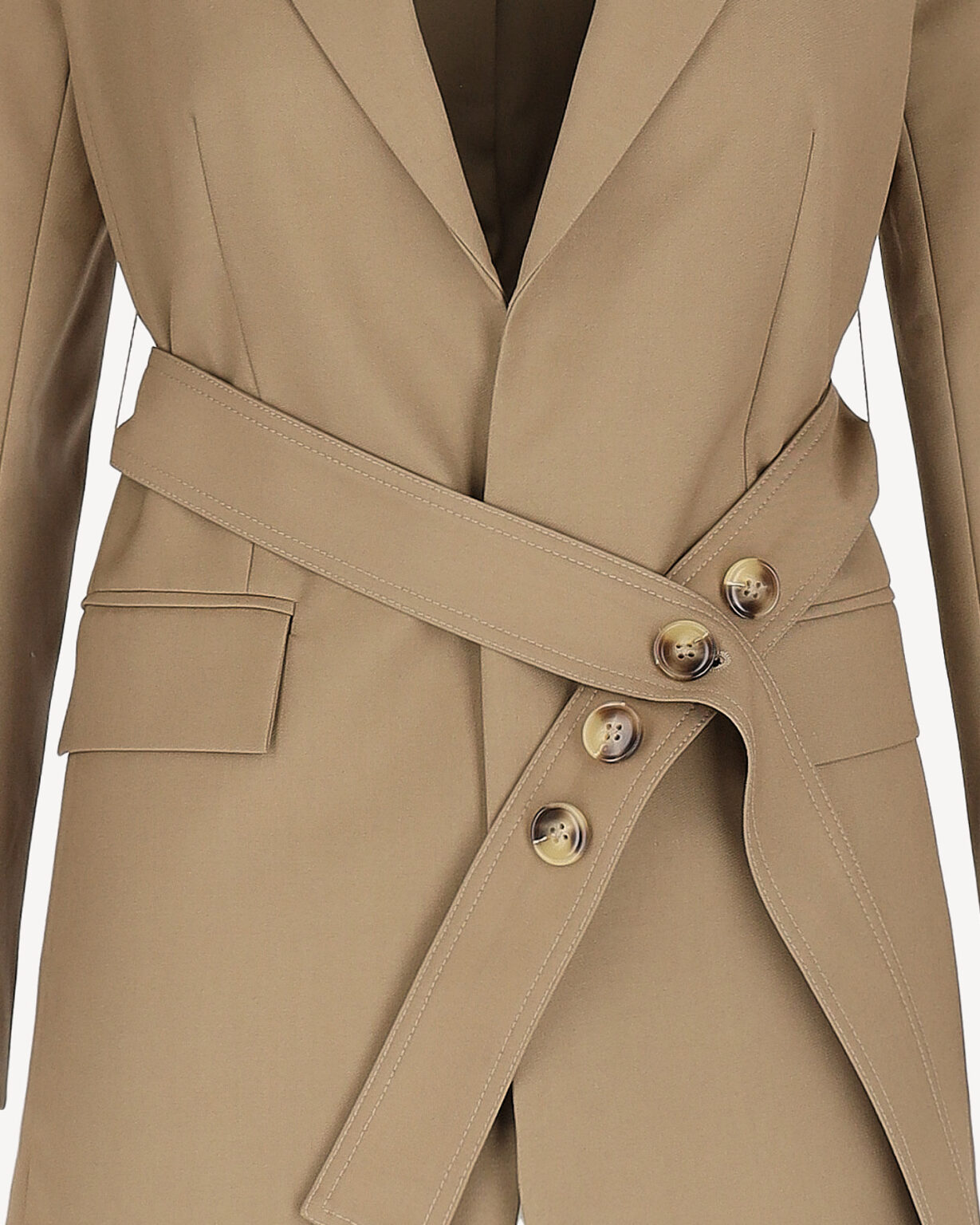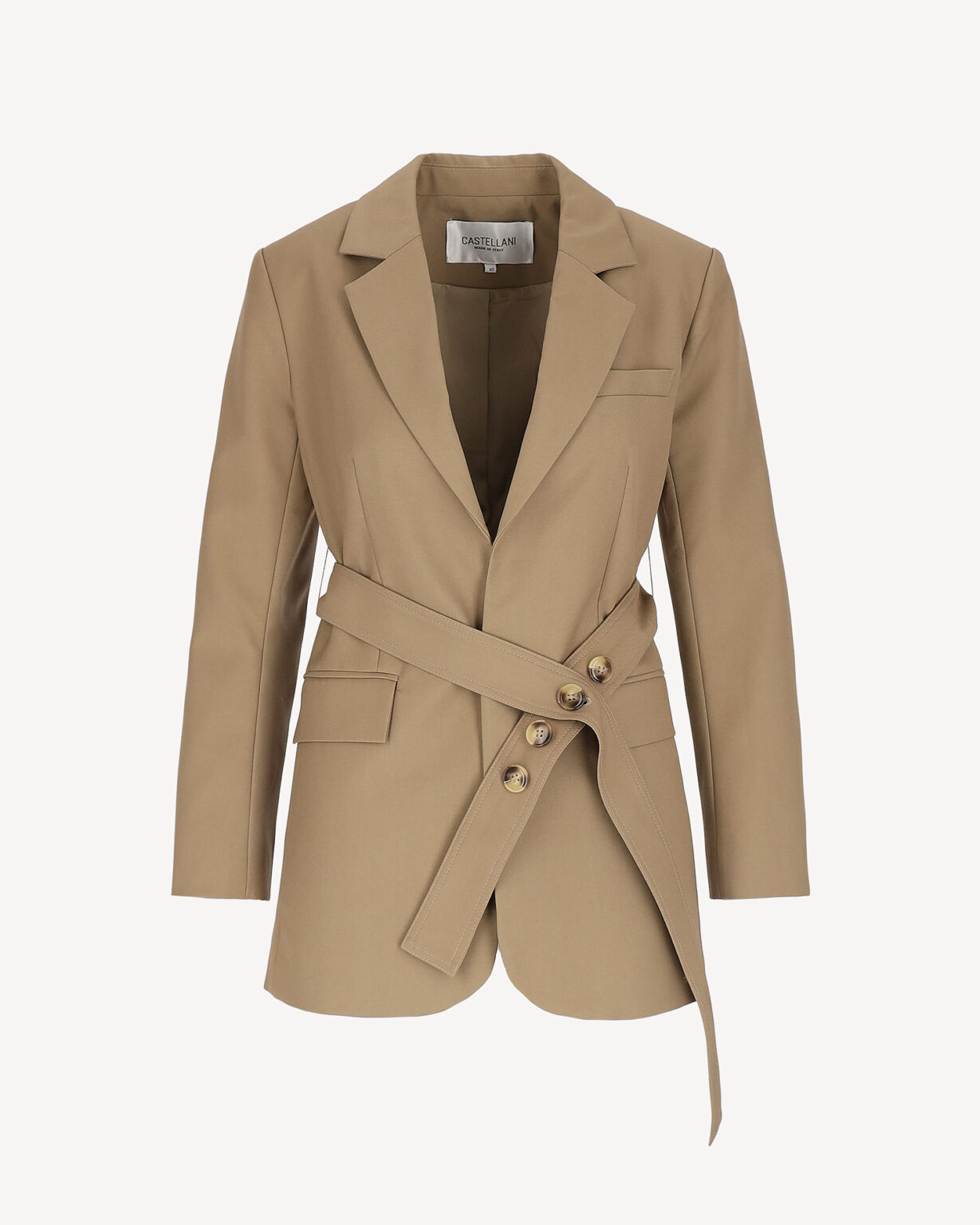 Elegancka marynarka damska o taliowanym kroju. Model zachwyca nowoczesną formą z dodatkowym, dekoracyjnym paskiem przewiązywanym w talii, który podkreśla sylwetkę i dodaje jej wysmuklenia. Klasyczny kołnierz z klapami, dopracowane przeszycia oraz strukturalny materiał tworzą luksusowy efekt charakterystyczny dla marki CASTELLANI. Marynarka posiada minimalistyczne wykończenia, dwie kieszenie z patkami oraz subtelną linię ramion, dzięki czemu prezentuje się wyjątkowo szykownie zarówno do stylizacji biznesowych, jak i wieczorowych. Idealna do spodni, ołówkowej spódnicy lub nałożona na jedwabny top.