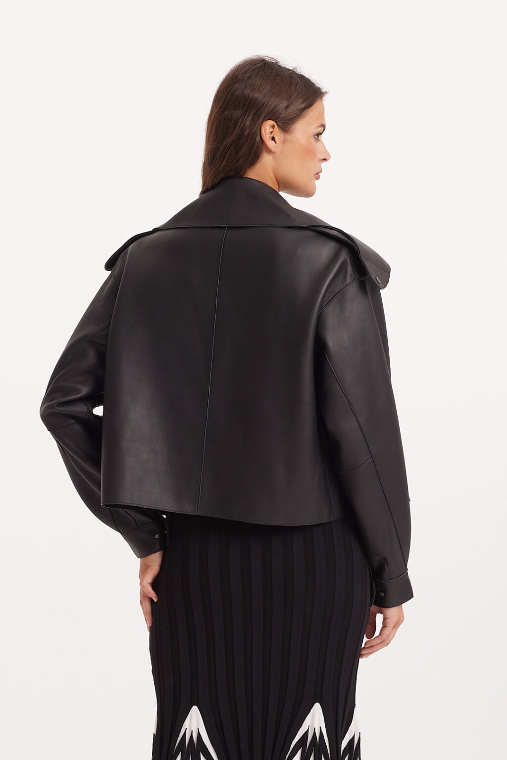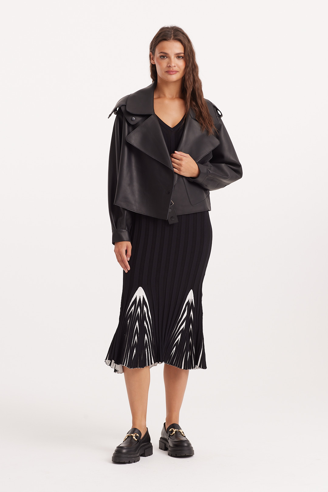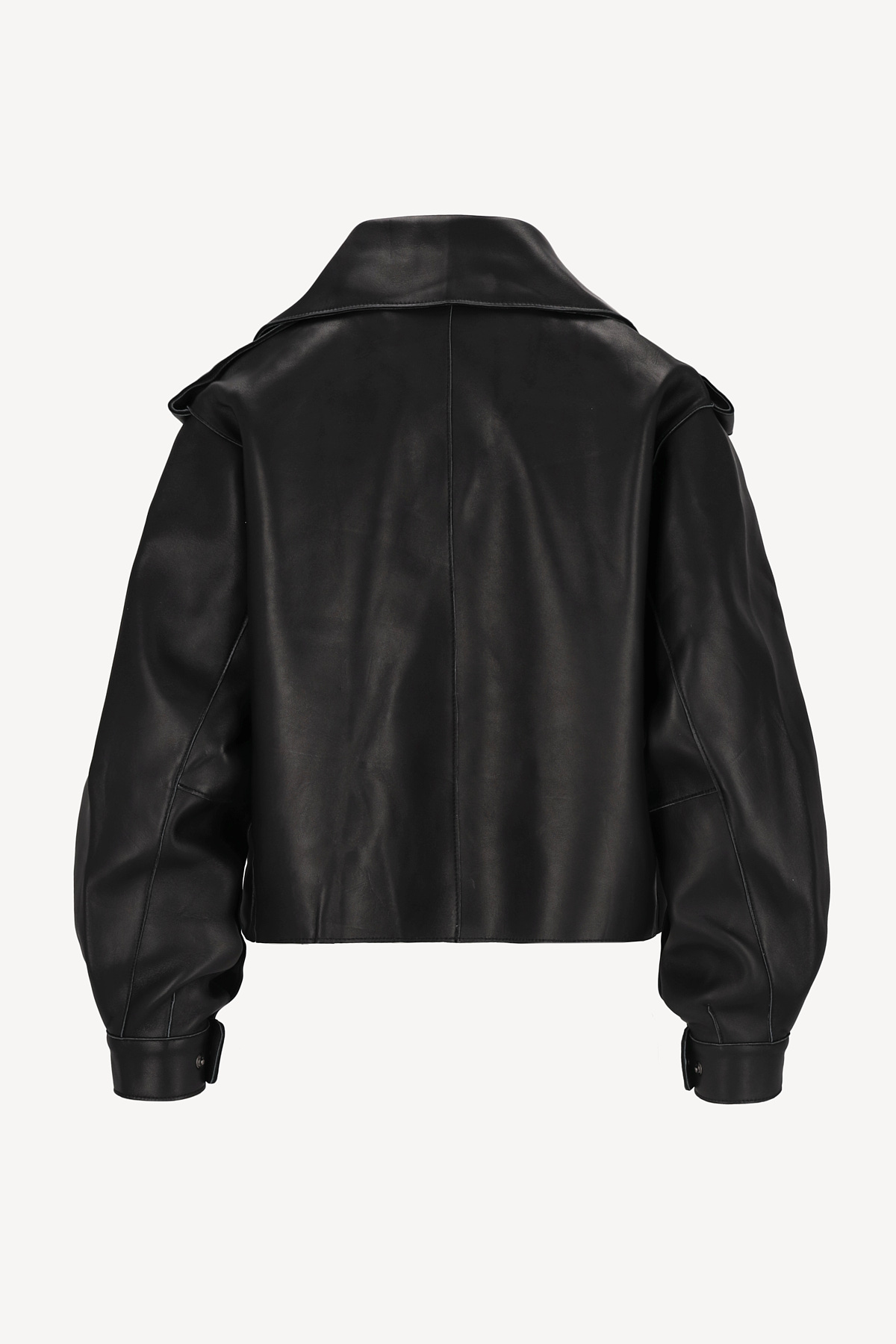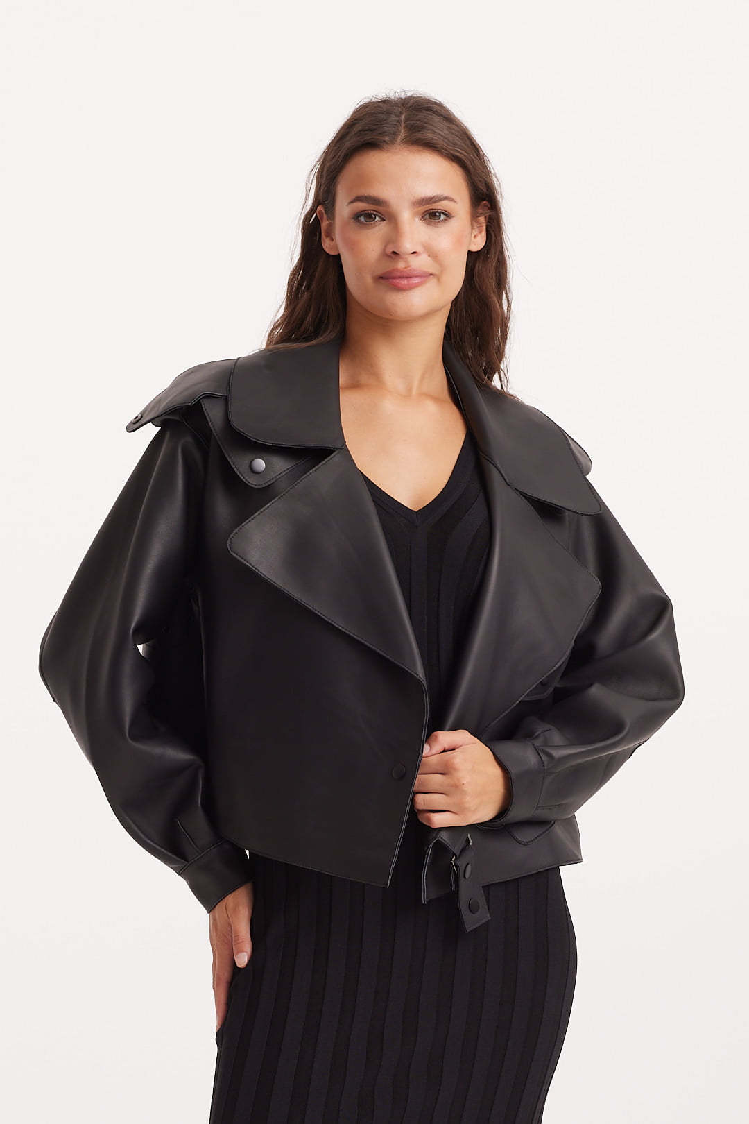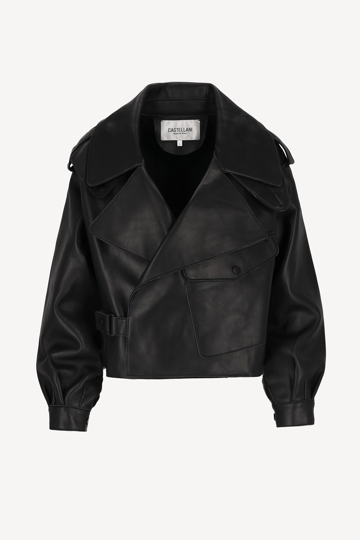 Krótka kurtka/ramoneska wykonana z wysokiej jakości, miękkiej skóry naturalnej w czarnym kolorze. Ma wyrazisty, nowoczesny krój z szerokimi klapami, obniżoną linią ramion i ozdobnymi pagonami. Asymetryczne zapięcie na napy, kieszeń z patką oraz pasek z klamrą w talii nadają jej charakteru i ponadczasowego stylu. Rękawy zakończone mankietami z napami podkreślają dopracowane detale. Model bez podszewki, dzięki czemu jest lekki i miękko układa się na sylwetce. Idealna na sezon przejściowy – doskonale prezentuje się zarówno z sukienką, jak i eleganckimi spodniami.