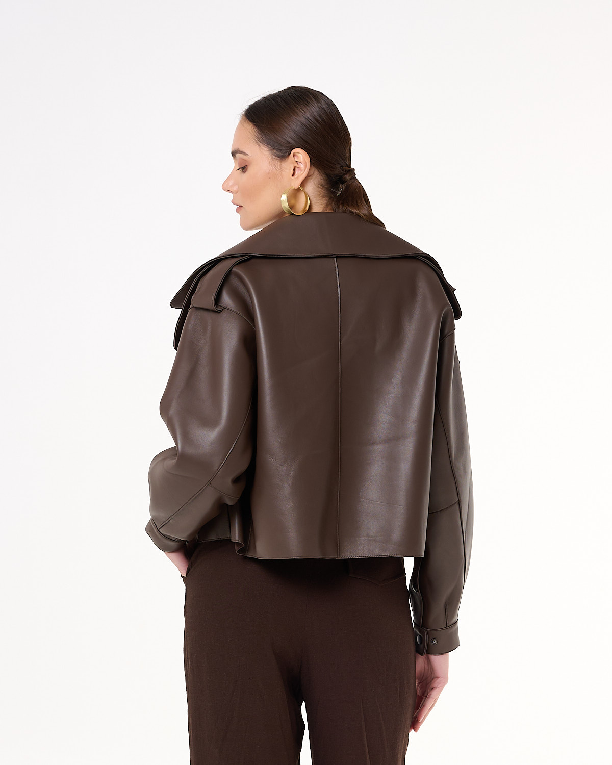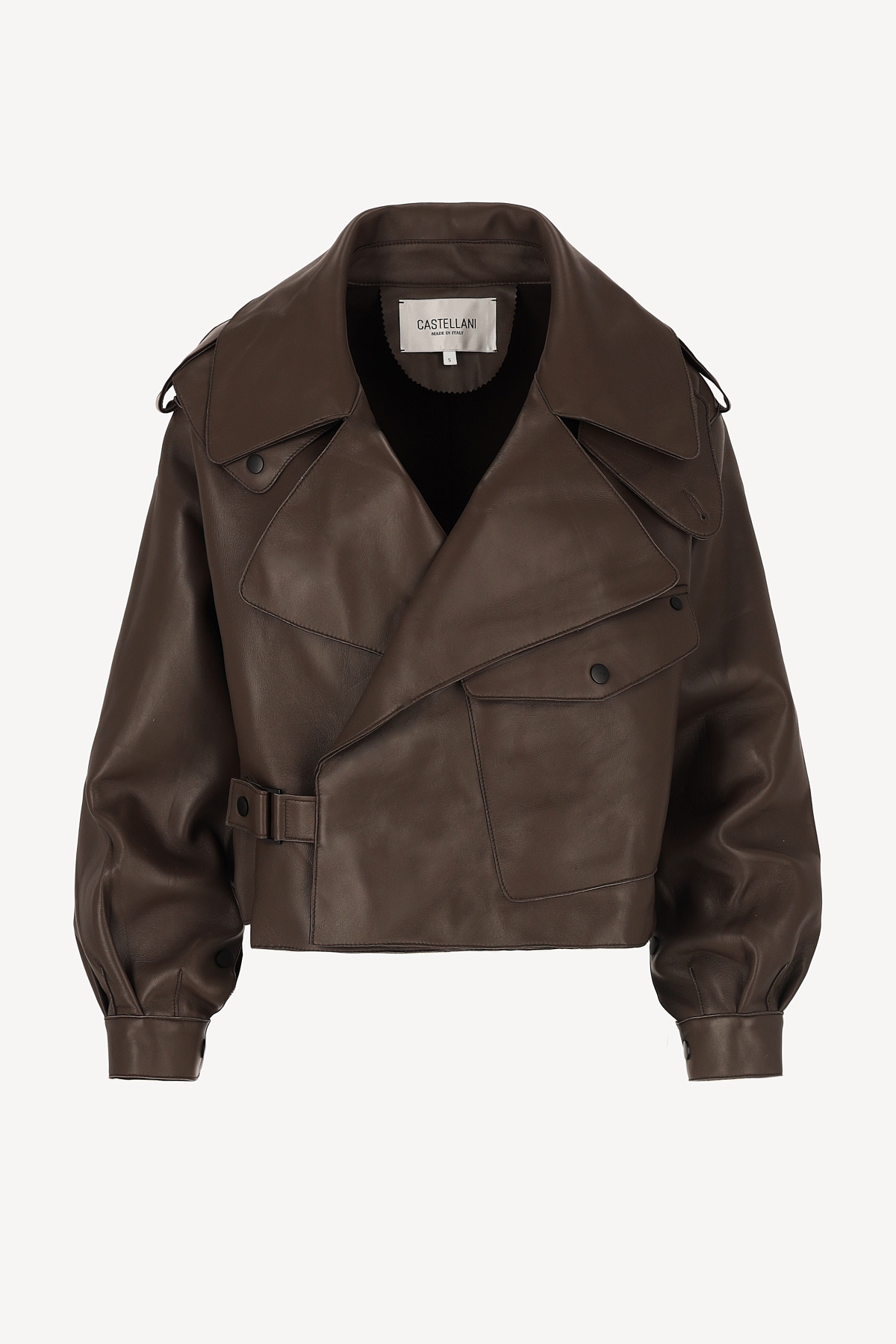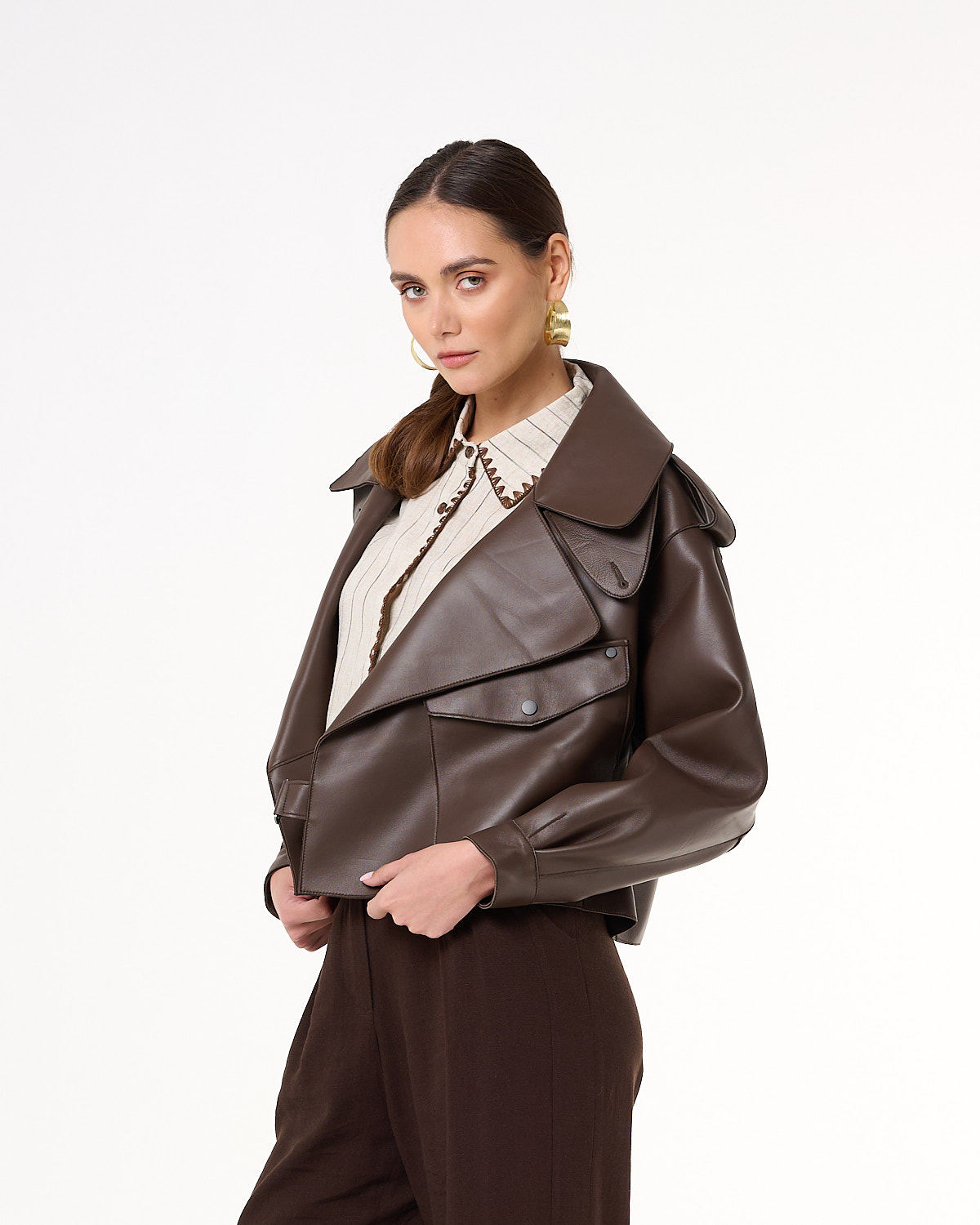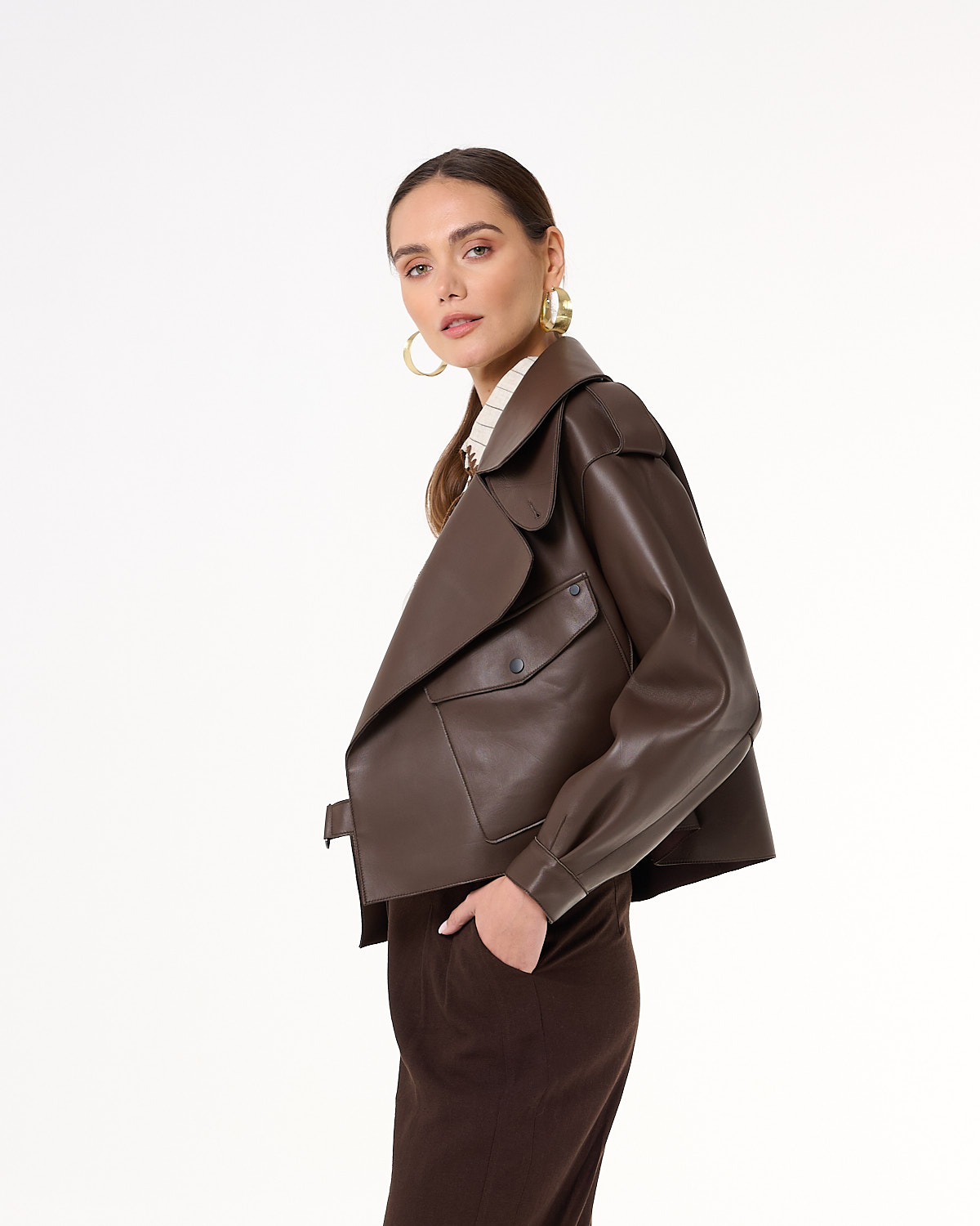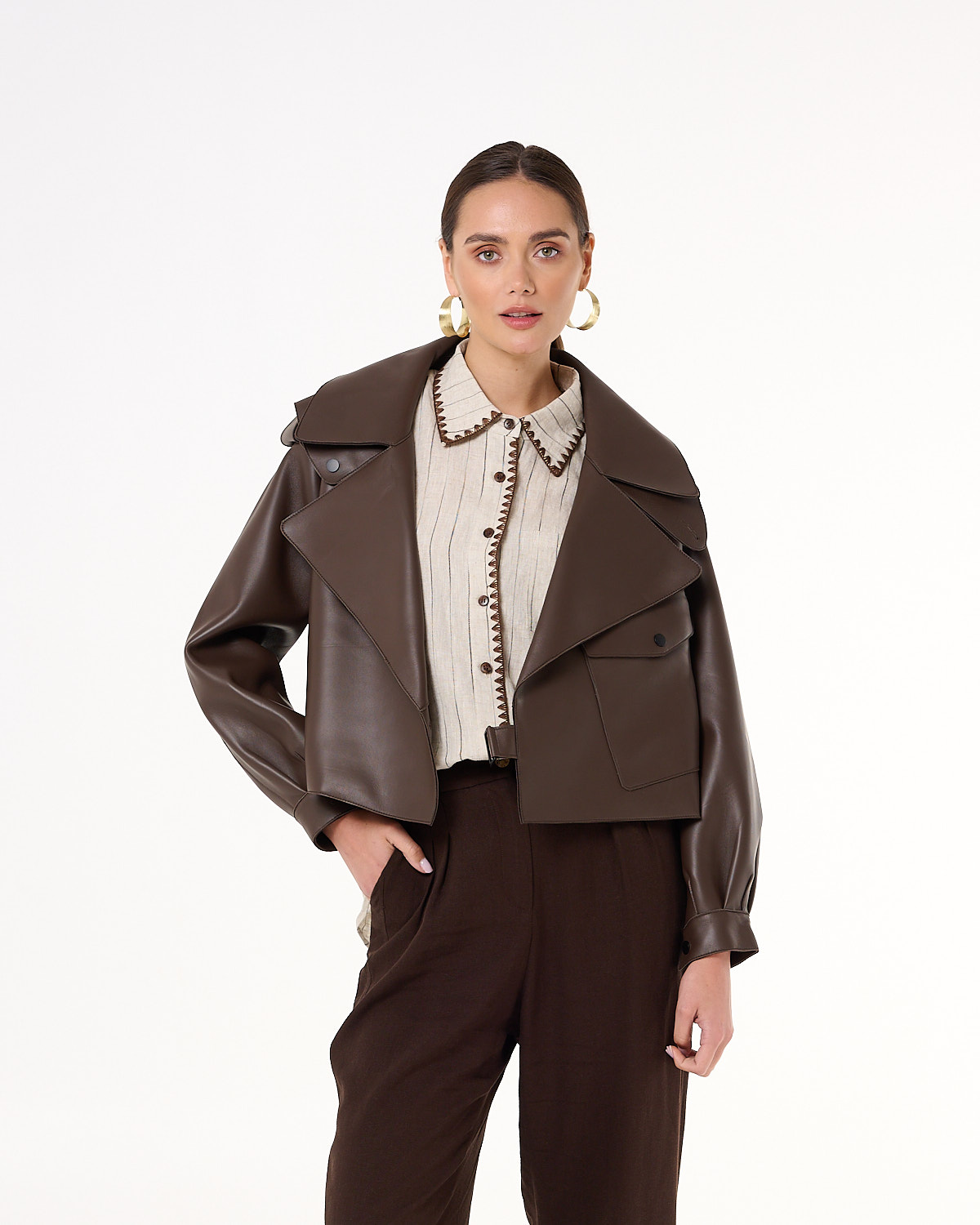 Krótka kurtka/ramoneska wykonana z wysokiej jakości, miękkiej skóry naturalnej w odcieniu ciemnego brązu. Ma wyrazisty, nowoczesny krój z szerokimi klapami, obniżoną linią ramion i ozdobnymi pagonami. Asymetryczne zapięcie na napy, kieszeń z patką oraz pasek z klamrą w talii nadają jej charakteru i ponadczasowego stylu. Rękawy zakończone mankietami z napami podkreślają dopracowane detale. Model bez podszewki, dzięki czemu jest lekki i miękko układa się na sylwetce. Idealna na sezon przejściowy – doskonale prezentuje się zarówno z sukienką, jak i eleganckimi spodniami.