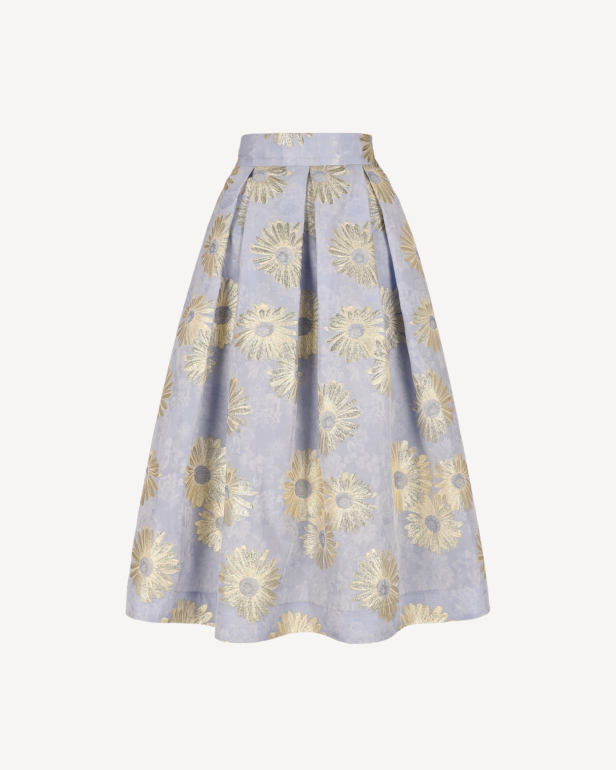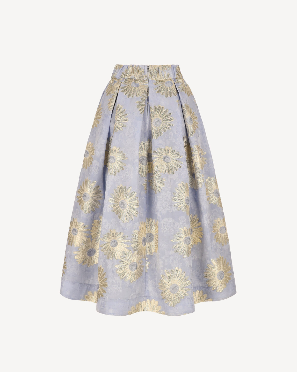 Elegancka spódnica midi z żakardowej tkaniny o delikatnym połysku. Rozkloszowany fason pięknie układa się na sylwetce, a praktyczne kieszenie dodają komfortu. Idealna na co dzień i na wyjątkowe okazje.