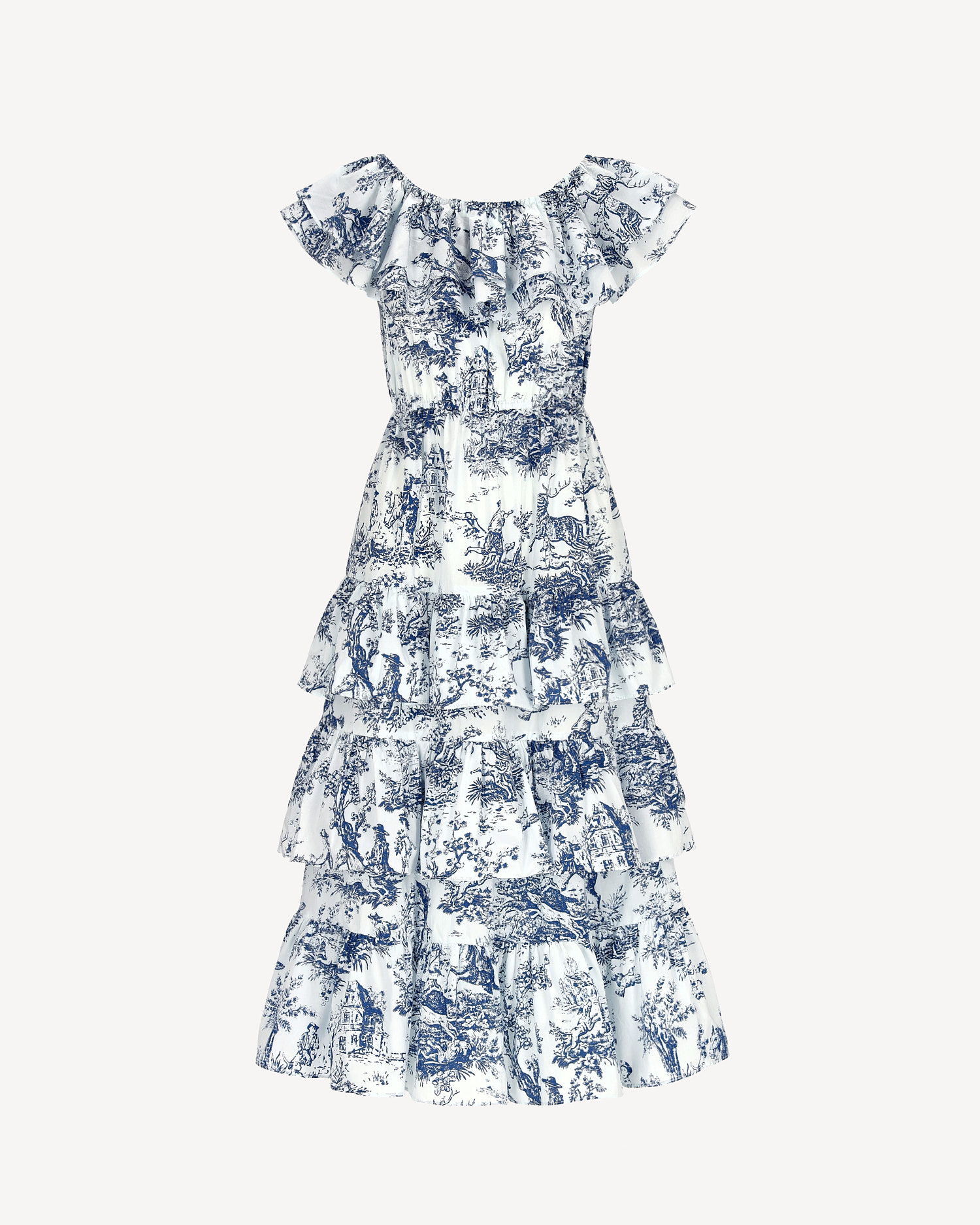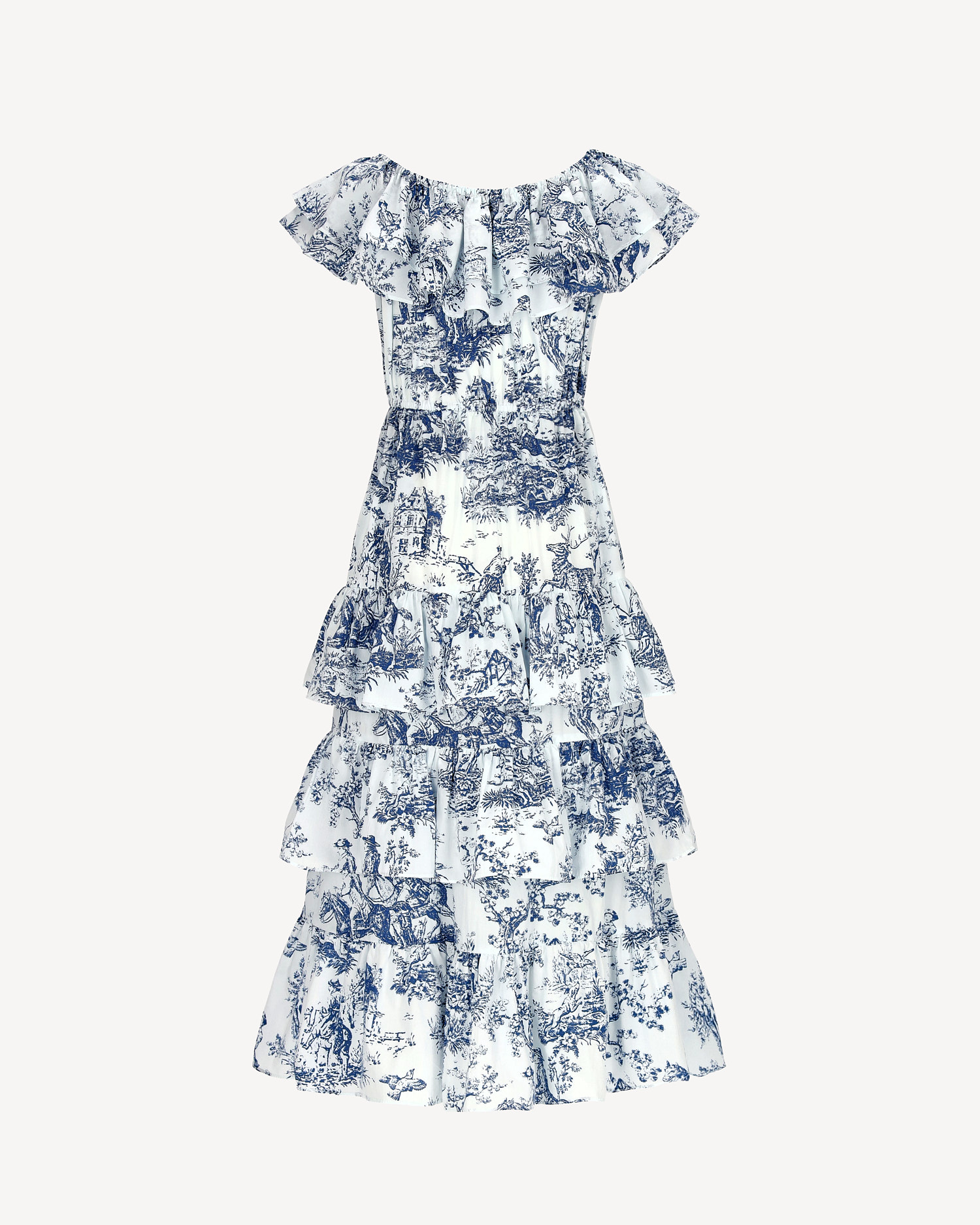Elegancka sukienka maxi wykonana w 100% z naturalnej bawełny, która zapewnia lekkość, przewiewność i wysoki komfort noszenia. Model wyróżnia się romantycznym wzorem w stylu toile de Jouy w odcieniach niebieskiego na białym tle, inspirowanym klasycznymi francuskimi tkaninami. Sukienka posiada elastyczny dekolt z falbaną, dzięki czemu można ją nosić zarówno klasycznie, jak i opuszczoną na ramiona w stylu hiszpańskim. Talia została delikatnie podkreślona, a rozkloszowany dół z kilkoma falbanami nadaje sylwetce lekkości i elegancji. To idealna propozycja na letnie przyjęcia, wakacyjne wyjazdy, spacery nad morzem czy eleganckie spotkania w ogrodzie.
