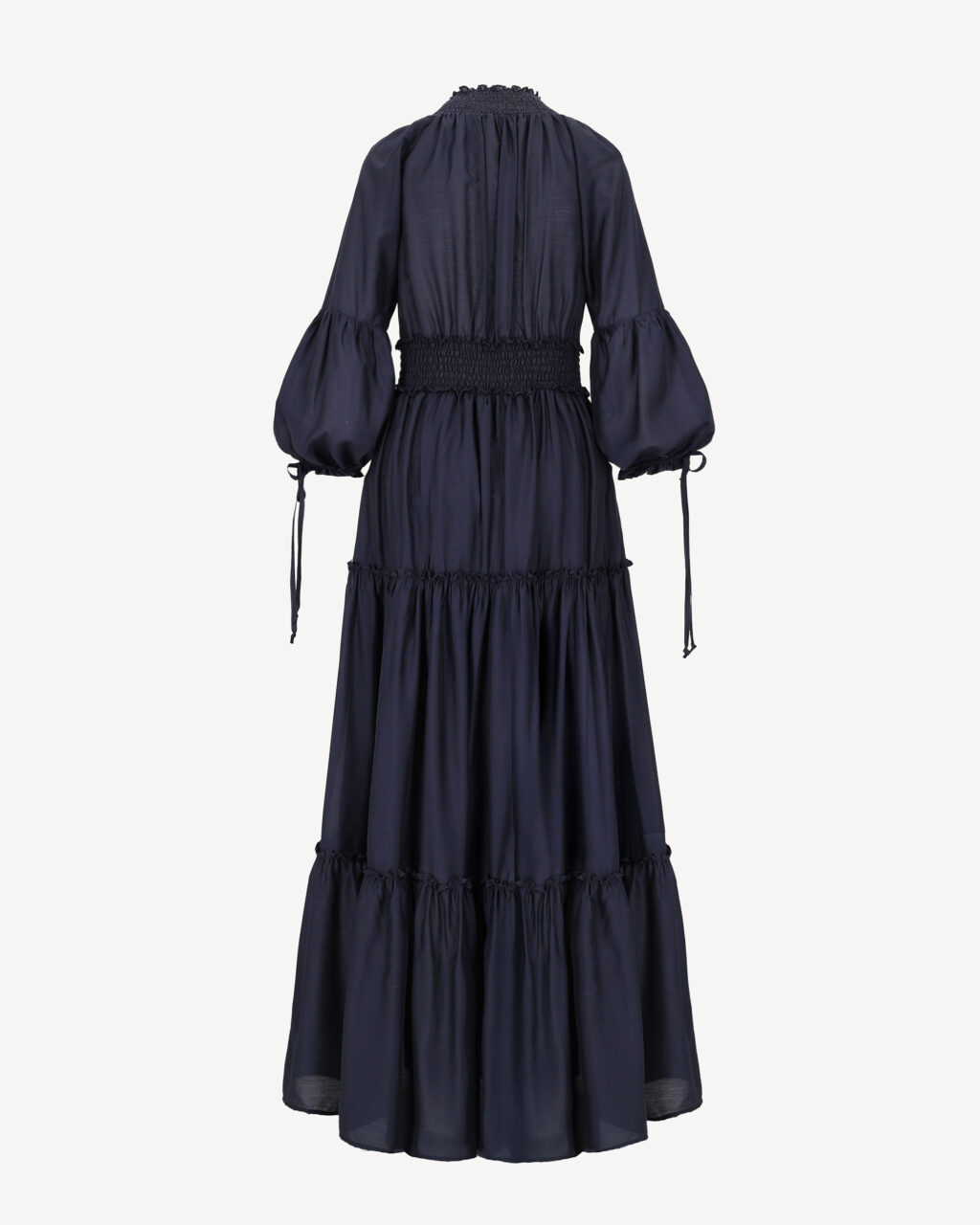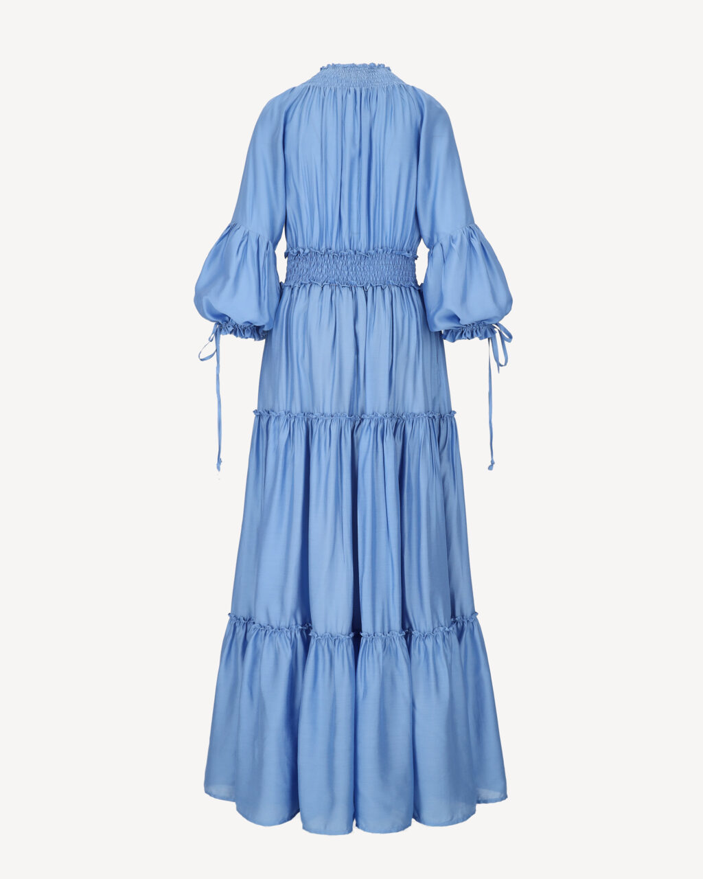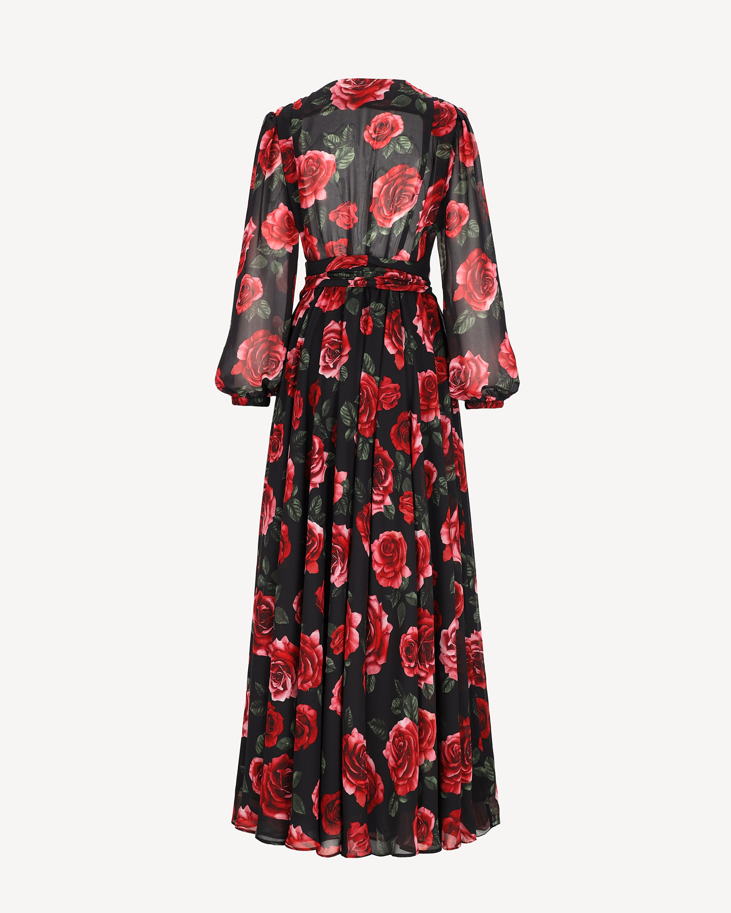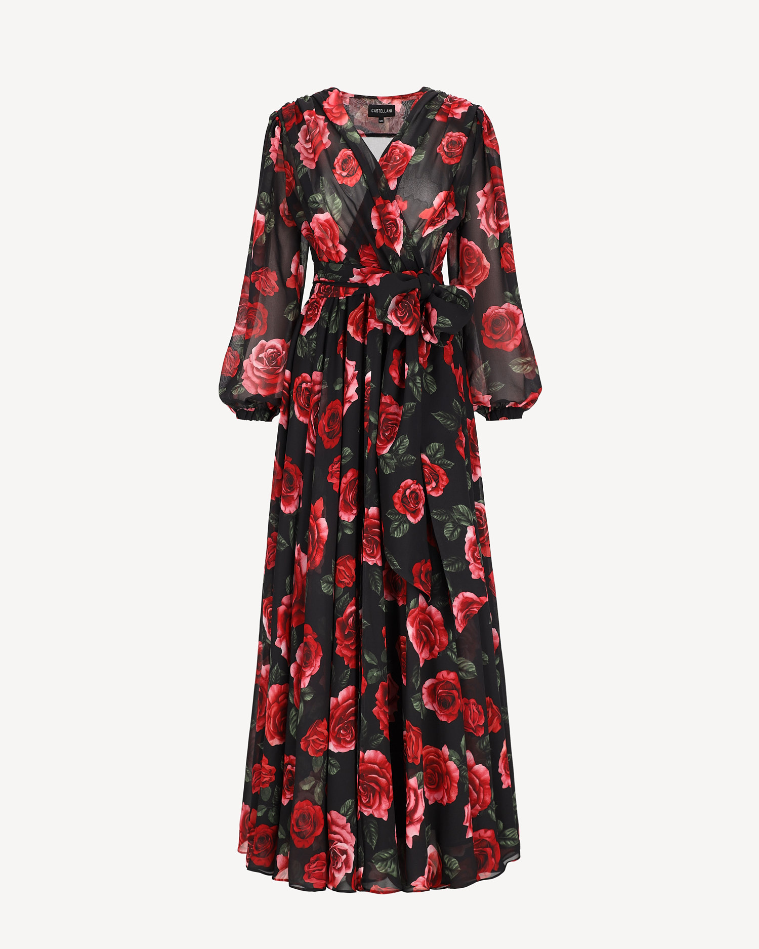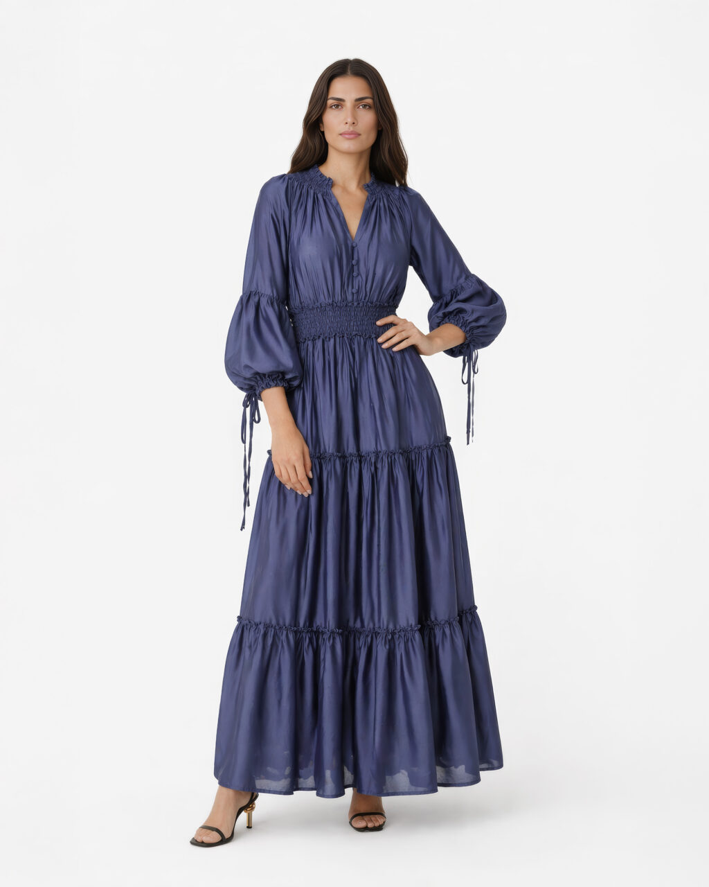 Sukienka maxi o spektakularnym kroju z obszernym podwójnym dołem. Dekolt zakładkowy układający się w literę V, rękawy długie bufiaste wykończone gumką. W pasie guma, świetnie dopasuje się do każdej sylwetki. Dół sukienki bardzo szeroki z kontrastową podszewką, widoczny rozporek z przodu. Sukienka posiada dodatkowo szeroki pasek który podkreśli Twoją talię.
